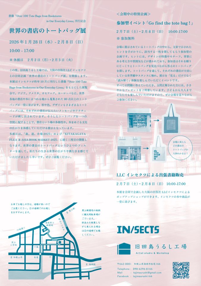 2026年1月28日(水)より旧田鳥うるし工場(海南市)で『世界の書店のトートバッグ展』が開催。大阪の出版社「L.L.Cインセクツ」が咋年10月に刊行した書籍『Over 100 Tote Bags from Bookstores in Our Everyday Lives』をもとに企画された展覧会で、アジア、アメリカ、オセアニア、ヨーロッパなど、世界各地の書店や、本にまつわる場から募集された80点以上のトートバッグが一堂に集結します。