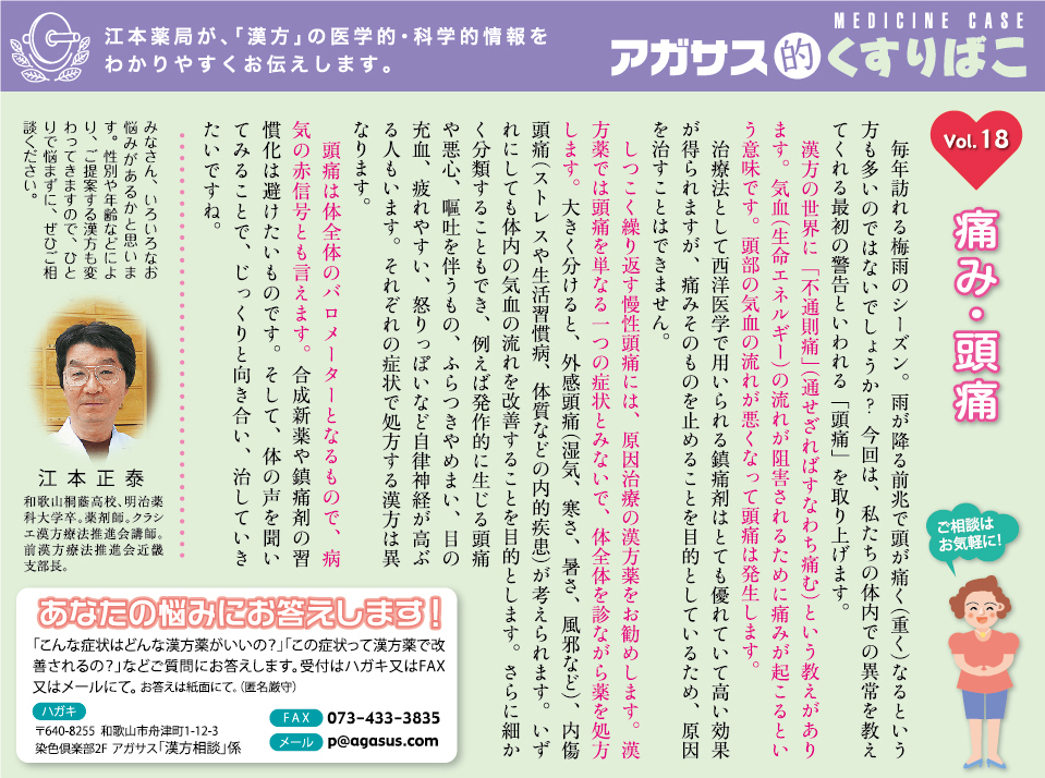 和歌山タウン情報アガサス・ビィにて連載中のコラム『漢方Q&Aお悩み相談室』第11回~第20回を公開! 同コラムは、2011年2月号より連載スタート。読者から寄せられた身体や心の悩みに『漢方 江本薬局』(和歌山市毛見)の江本正泰さんが答える企画です。何らかの身体の不調に気づいた時、当相談室の扉を開いていただければうれしいです。