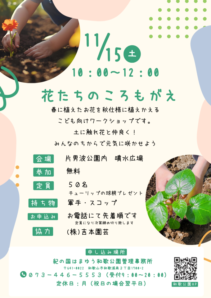 11月15()、片男波公園内噴水広場にて、春に植えた花を秋仕様にかえる子ども向けのワークショップを開催します。“土に触れ、花と仲良く”しながら、みんなの力で元気な花を咲かせましょう!
