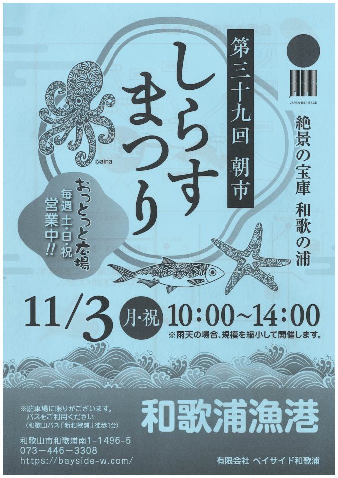 2025年11月3日(祝)和歌浦漁港駐車場内にて、『第39回和歌浦漁港朝市(おっとっと広場)しらすまつり』が開催される。