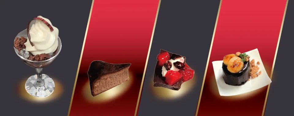 左から①チョコレートのパフェ ②チョコレートのバスクチーズケーキ ③チョコのテリーヌ ④チョコバナナのムース