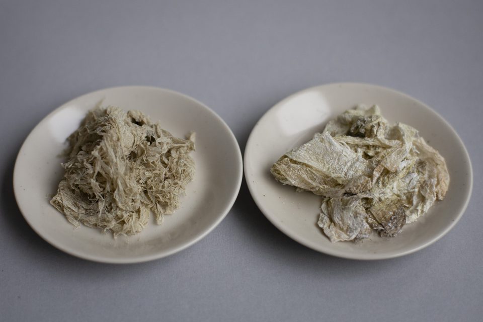 一方のおぼろ昆布。よく見るとひらひらとした薄い板状になってます。