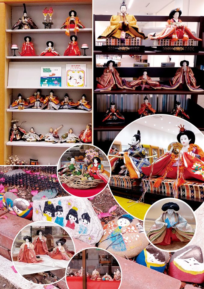 イベントの見どころは、各会場で趣向を凝らした展示だ。例えば海南nobinosでは図書館らしく本を手にするひな人形が随所に見られる。館内には豪華な段飾りもあれば、本棚と本棚の間のわずかな隙間に1人(?)だけちょこんと座っていたりして、ゲーム感覚で探してみるのも楽しい。ひな人形の捜索は、読書中、勉強中の人もいるのでくれぐれもお静かに。