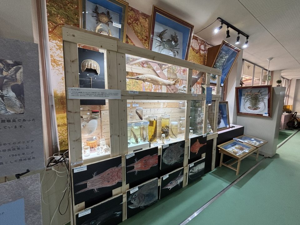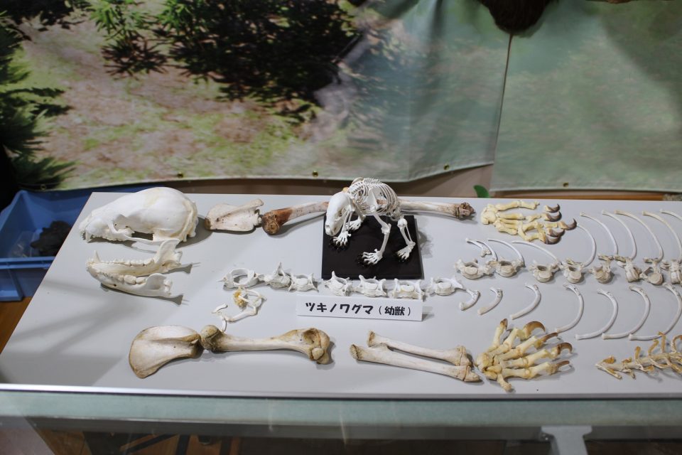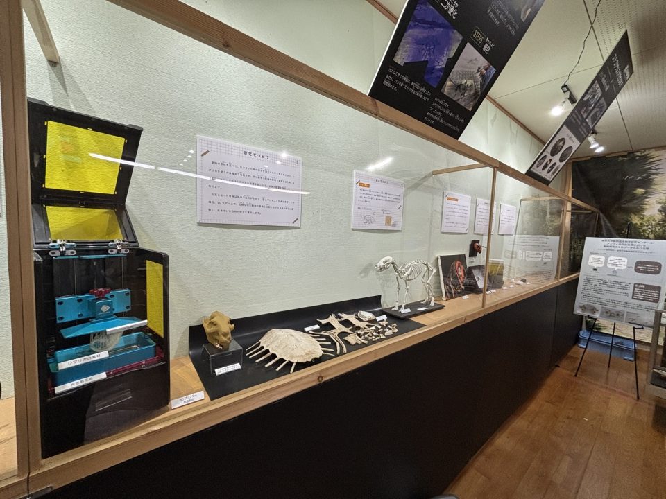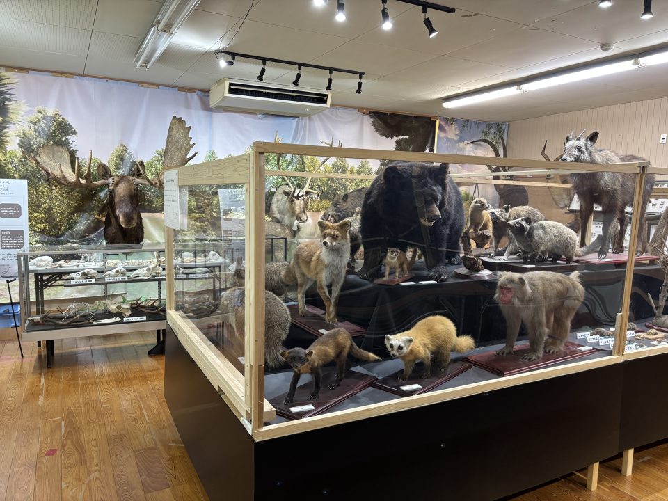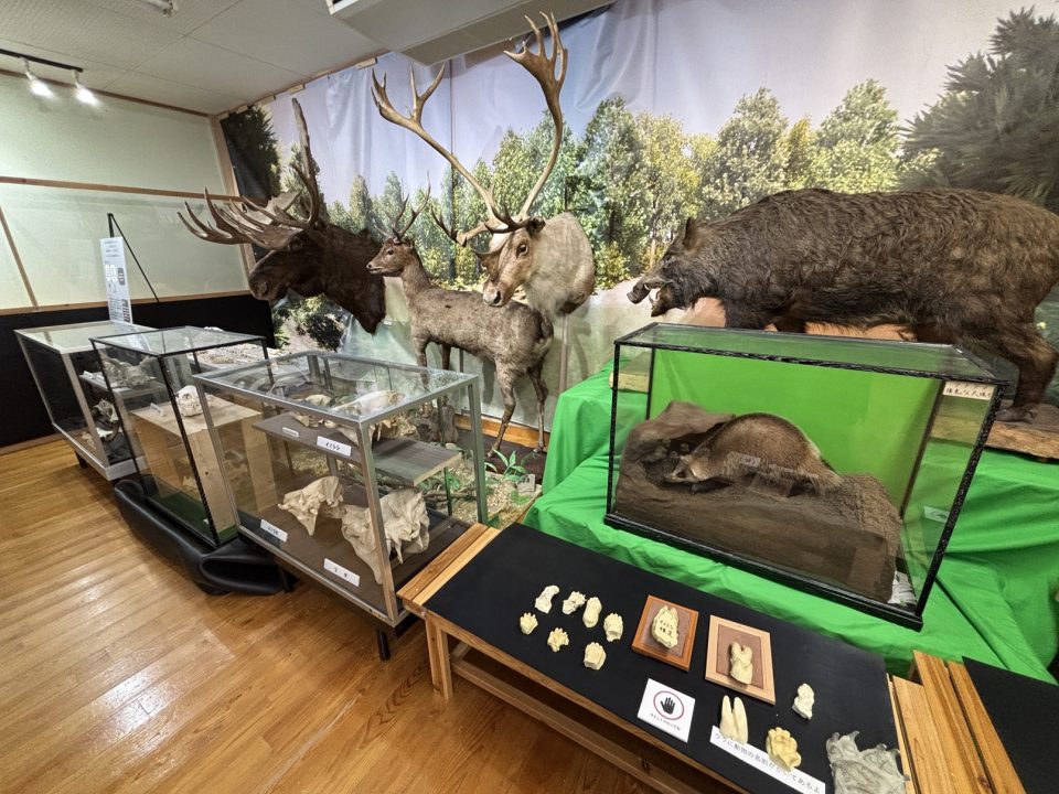 行ったり来たりしましたが、再び展示室に戻りましょう。ここでは紀美野町などに生息する生き物を紹介。骨格標本や、X線CTで撮影された動物の骨格レプリカ、周辺に生息する昆虫の展示、動物のはく製を展示しています。真顔で見つめるはく製たちは怖くもあり、可愛げもあり。でもこれが野生のリアルなのよね。